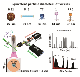 病毒是自然界分布最广、个体数量最多的生命形式,然而现有的病毒表征方法存在检测速度慢或者分辨率不足等缺点。颜晓梅教授课题组长期致力超高灵敏流式检测技术(high sensitivity flow cytometry, HSFCM)的研发,通过研制具有自主知识产权的超高灵敏流式检测装置,实现单个纳米颗粒的高灵敏、高通量、多参数定量表征。继2014年首次实现发光能力低于单分子荧光的单颗粒散射检测(如粒径24 nm的二氧化硅纳米颗粒和7 nm的纳米金颗粒)(ACS Nano 2014, 8, 10998-11006),本研究基于HSFCM发展了一种无标记的病毒颗粒快速、准确测定方法。该方法可检测粒径仅为27 nm的MS2病毒,实现病毒颗粒粒径及其分布的准确测定,分辨率媲美透射电镜(对等效球体粒径仅相差4 nm的T7和Lambda噬菌体实现基线分辨)。相对于传统的透射电镜表征技术,该方法对病毒悬液进行直接检测,将分析时间从数小时缩短至几分钟,统计精确性高(检测速率每分钟高达10,000颗粒),为病毒表征提供了实用、高效的新方法。