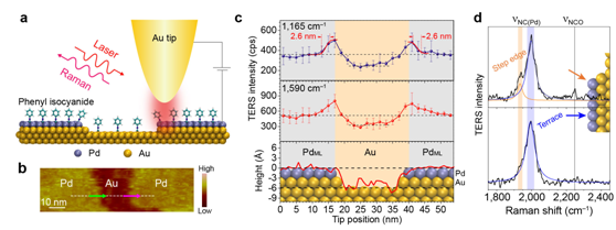 a. 实验示意图;b. Pd/Au(111)双金属表面STM图;c. TERS线扫描成像结果;d. 实空间观测台阶位特殊的电子性质。