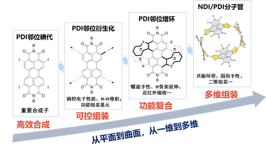 课题组近年来基于深入的机理研究(ACS Catalysis2018,8, 8070;Angew. Chem. Int. Ed.2019,58, 16770.),围绕苝二酰亚胺(PDI)、萘二酰亚胺(NDI)分子功能化的新方法学(Org. Lett.2017,19, 5438;Org. Lett.2018,20, 6117;Chem. Sci.2020,11, 1503.)、可控自组装(Angew. Chem. Int. Ed.2019,58, 15273;J. Am. Chem. Soc.2020,142, 3712.)及后续的器件开发(Nat. Commun.2021,12, 142.)展开系列工作。上述成果是这一系列工作的延续。
