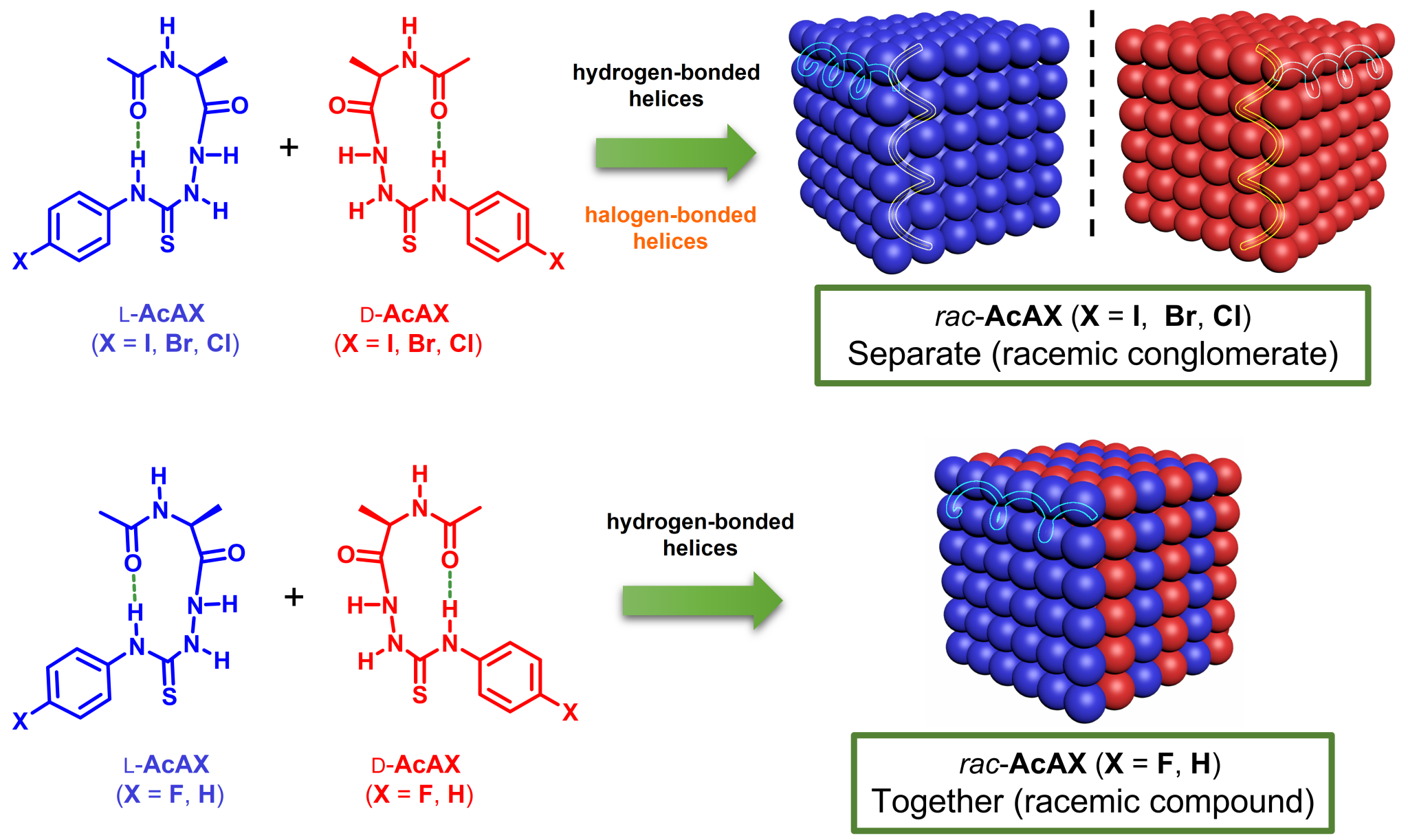江云宝教授课题组近年来在折叠短肽基超分子螺旋的构筑研究中取得系列进展(J. Am. Chem. Soc.2017,139, 6605;Nat. Commun.2019,10, 3610;Org. Biomol. Chem.2021,19, 6397;Chem. Commun.2021,57, 1802;Chem. Commun.2021,57, 12562;Chem. Commun.2022,58, 6461),发现超分子螺旋形成中呈现同手性特征,提出系因此而保障折叠结构单元螺旋性的有效延展之故。据此,形成了构筑二维或三维超分子螺旋以驱动三维同手性延伸、促进手性自发拆分结晶的研究设想。为此,设计将乙酰丙氨酸模型分子衍生为乙酰丙氨酰胺基硫脲,后者含有β-转角结构而呈折叠构象,赋予转角结构之间氢键相互作用的特性;续于分子中苯基硫脲的苯环对位引入卤素原子,折叠分子间因此又具有穿越转角结构的卤键作用可能。固体圆二色和红外光谱、手性色谱、X-射线粉末和单晶衍射等实验表明,修饰以碘、溴和氯等卤素原子的折叠短肽衍生物分子间具有强的卤键作用,可同时形成氢键和卤键超分子螺旋,构成二维正交螺旋,驱动结晶过程中的三维同手性延伸,实现外消旋体发生手性自发拆分结晶;修饰以氟原子或不含卤素原子的折叠短肽衍生物分子无法提供卤键作用,仅形成一维氢键超分子螺旋结构,外消旋体发生共结晶。该项研究为理性构筑手性自发拆分结晶体系提供了新的思路。