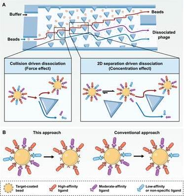 为了解决上述问题,该研究从化学平衡的角度切入,基于确定性侧向位移微流控平台,独辟蹊径地构建了一种高亲和力分辨的识别分子筛选系统SCOPE。该系统基于高频碰撞实现物理分离,利用“动能-内能”转换打破配体-目标结合的非共价键,从而通过力的作用将平衡推向解离方向;利用微流体动力学通过二维分离不断地将解离的游离态分子与靶标复合物分离开,以防止二次结合,从而进一步通过浓度效应促进解离。通过力学、浓度效应耦合的平衡驱动,该系统可去除更多的低亲和力、中亲和力识别分子,最终实现对高亲和力识别分子的富集。针对特定肿瘤标志物靶标,该系统可在一天内实现高效的单轮多肽配体筛选,以代替传统分子筛选中周计的繁琐流程。SCOPE系统对不同靶标和筛选文库均有很好的普适性,为高亲和力识别分子的高效筛选提供了新的策略,有望为生物分析、医学诊疗等领域提供重要的识别分子基础。