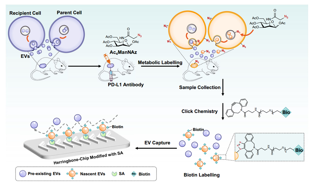 近日,我室宋彦龄教授团队开发了一种基于代谢聚糖标记辅助的微流控分离策略,可以选择性地分离受外部刺激后机体新产生的细胞外囊泡。相关研究成果以“Capturing Nascent Extracellular Vesicles by Metabolic Glycan Labelling-Assisted Microfluidics”为题发表于Nature Communications杂志(Doi:10.1038/s41467-023-42248-9)。