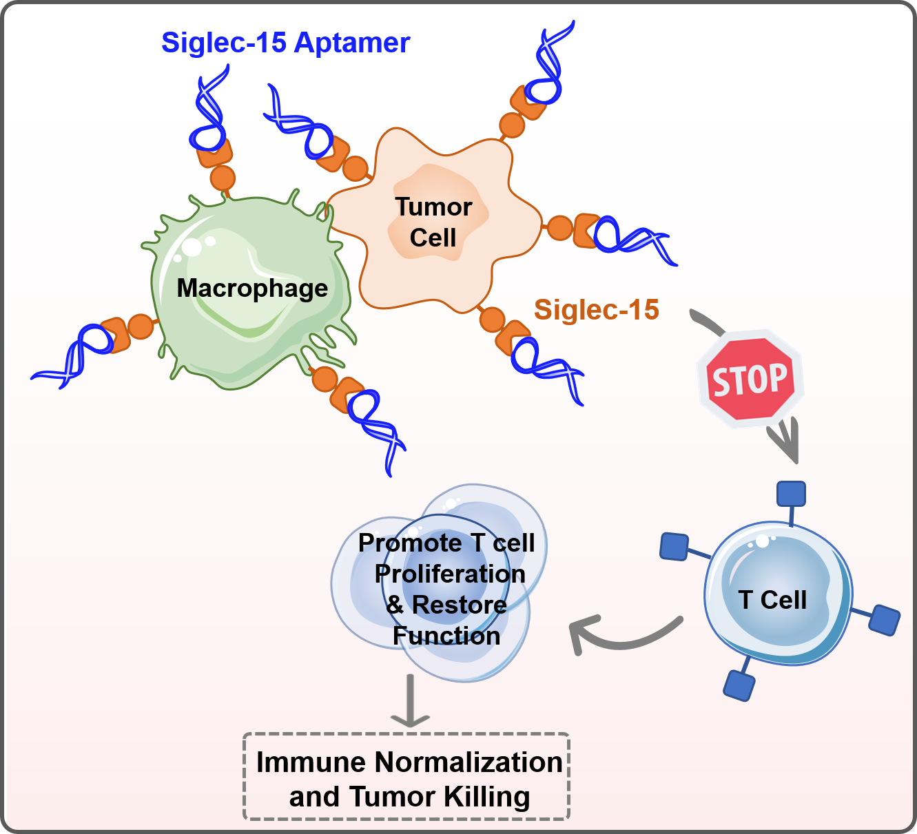基于这一发现,宋彦龄研究团队提出了一种新型的核酸适体介导免疫检查点阻断(Ap-ICB)策略,旨在阻断免疫检查点Siglec-15与T细胞互作,从而激活T细胞。与传统抗体疗法相比,这种单链核酸适体由于分子量更小,具有更好的组织渗透性和较低的免疫原性。此外,适配体的小尺寸和缺乏Fc片段降低了它们引发免疫相关副作用的风险。通过从头定向进化,团队鉴定出一种高亲和力的单链DNA适体WXY3,它能特异性地结合Siglec-15,且平衡解离常数在纳摩尔级,为精准治疗提供了可能。体外实验表明,WXY3序列能够解除Siglec-15对T细胞的增值抑制作用,恢复T活性。在小鼠模型中,WXY3序列显著抑制了肿瘤生长和转移;此外,单细胞RNA测序技术揭示了WXY3治疗后肿瘤微环境中巨噬细胞和T细胞功能的增强。为了进一步提升抗肿瘤效果,还开发了基于WXY3的球形核酸(Ap-SNA),多价结合和空间匹配阻碍进一步增强了对Siglec-15介导免疫抑制的阻断效果,展现出更强的抗肿瘤活性。综上,针对免疫检查点Siglec-15的Ap-ICB策略,特别是WXY3适体及其衍生物Ap-SNA,为癌症免疫治疗提供了一种潜在的新途径,特别是对于那些对传统PD-1/PD-L1疗法有抵抗性的病例。