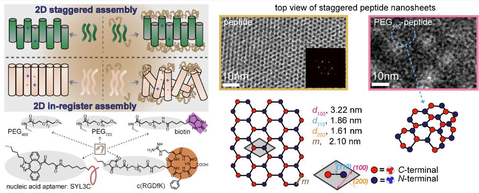 为此,团队提出一种新策略,使弱相互作用的自组装多肽在功能化修饰后仍维持其组装体原始形貌。团队设计的多肽分子通过分子间疏水、氢键和静电作用协同形成三聚体组装基元。基元间经精准设计的静电作用分别以纵向0.87 纳米错位和对齐排列方式形成表面“凹凸”和“平整”的片状纳米结构。错位组装的多肽在肽末端修饰了PEG、生物素、五元环肽或核酸适体功能分子后依旧高效地形成纳米片结构,而对齐排列的多肽经修饰无法复现二维组装形貌。团队认为,错位组装增大了功能分子间以及功能分子与邻近多肽间的间隔,降低了功能分子的尺寸、形状和电荷等因素对多肽自组装的影响。动态组装体内分子结构的高度可重塑性也使多肽通过扭曲组装“晶格”来应对功能分子带来的干扰。该策略使众多易解聚和形变多肽组装体的高密度功能化修饰成为可能,也允许通过改变功能分子的种类、数量和分布密度,大范围调控组装材料的表面性质。作为验证,团队针对U87MG glioma细胞筛选出了高亲和力细胞识别纳米材料。