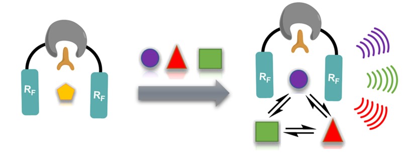 对真实复杂样品的快速准确检测在食品安全监测、生产过程控制、疾病诊断及生物机制研究等方面都有重要的应用。目前色谱分析技术在复杂体系检测中应用最广,但其基于分离,相对耗时,难以满足高通量及原位检测需求。利用光谱及化学传感方法可以避免分离,实现原位快速分析,但分析准确性易受杂质的干扰并且难以获取样品精确的组分信息。色谱方法的“高精确性”和光谱/化学传感方法的“原位及快速性”是分析领域一直追寻的优良检测特性,然而却难以整合在同一种分析技术中。本报告将介绍一种基于核磁共振氟谱和动态可逆交换的化学传感方法,检测中无需分离、无需标记、实时在线地得到类似于色谱峰的检测信号,精确对应复杂体系中的各个组分(图1)。该方法独特的检测能力为研究复杂系统中的多组分相互作用及演化规律提供了有力工具。同时,利用具有独特手性空腔的含氟核磁共振探针可以对醇、酰胺、环醚、亚砜等大量结构不同的手性化合物进行快速分析并确定其绝对构型,为手性相关研究领域提供新的高通量检测手段。