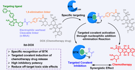 为了提高伊布替尼的肿瘤杀伤效果,同时减少耐药性的问题,本团队提出了一种新颖的“靶向共价激活化疗”策略,将高选择性的TCI药物与高毒性但是缺少靶向性的化疗药物通过“稳定又可激活”的连接子结合在一起,实现细胞毒性的协同增强和定点可控释放。在此思路的指导下,我们设计并合成了靶向共价激活化疗药物Ibt-DOX,该药物以伊布替尼为靶向配体,引入高毒性的阿霉素(DOX)为待激活化疗药物,同时设计α-甲基丙烯酰胺(α-MAA)为可激活亲电弹头,并插入对羟基苯甲醇作为自消除连接子。研究发现Ibt-DOX可特异性识别结合细胞内BTK的Cys481残基,形成稳定共价加合物,进而抑制BTK介导的BCR信号通路;在发挥靶向共价抑制作用的同时,触发连接子的亲核加成消除断裂反应,释放高毒性DOX,诱导免疫原性细胞死亡(ICD),TCI与DOX的协同作用显著增强了对B细胞恶性肿瘤的毒性。体内外实验一致表明,相较于伊布替尼,Ibt-DOX不仅展现出更优异的抗肿瘤活性(IC50达到nM级,抑瘤率54%),且显著降低了DOX对BTK阴性细胞的脱靶毒副作用,从而提高了药物的安全性。本研究通过将靶向共价抑制作用与高毒性化疗药物有机结合在一起,实现了细胞毒性的协同增强和定点释放,未来将为研发治疗不同癌症的新型靶向共价化疗药物提供新思路。