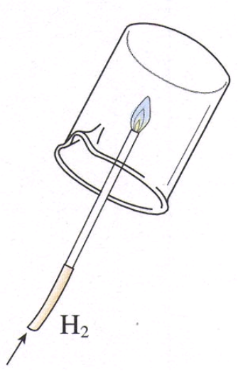 不过,你也不要害怕氢气,纯净的氢气燃烧时是十分“温顺”的。在带尖嘴的导管口点燃纯净的氢气,可以观察到氢气安静地燃烧,产生淡蓝色的火焰(氢气在玻璃导管口燃烧时,火焰常略带黄色),用烧杯罩在火焰的上方时,烧杯壁上出现小液滴,氢气与氧气反应会生成了水并放出大量的热。我们在点燃氢气前,一定要检验氢气的纯度:用排水法收集一试管氢气样品,用拇指堵住,靠近火焰,移开拇指点火,若听到尖锐的爆鸣声,说明氢气不纯;若只有“扑”的一声才表明氢气纯净。