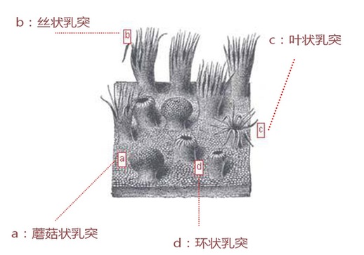 人的味蕾主要分布在舌头的四种突起结构上,如下图示,分别为:a.蘑菇状乳突;b.丝状乳突;c.叶状乳突;d.环状乳突 。