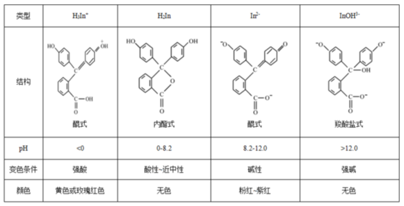 从上表可以看出,指示剂的显色与其微观结构变化相关,一般而言,有机物结构中的共轭体系越大,物质显示的颜色越深。从上述结构式中可以看出,在酚酞的两个醌式结构中,其共轭体系更大,而内酯式和羧酸盐式中的共轭体系较小,所以颜色有所不同。