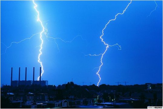 和电动机产生臭氧的原理差不多,雷雨天气里出现的臭氧,也是这样来的。我们知道,当一块带正电的云和一块带负电的云相遇了,会发生放电现象,这时候就出现了雷。放电时电流击穿空气产生电弧,这便是我们所看到的闪电。云携带的电荷很高,每朵云之间的电位差也很大,有时往往相差几亿到几十亿伏,这样一来,它们之间就会产生巨大的电火花,把氧气变成臭氧。
