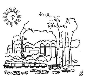 在天气晴朗时,这些废气中的氮氧化物和碳氢化合物经阳光中的紫外线照射发生一系列由光引起的复杂化学变化,称为光化学反应。光化学反应会产生大量的臭氧、醛类和其他一些复杂的有毒物质。它们混和在一起,形成一种浅蓝色烟雾,就是光化学烟雾。