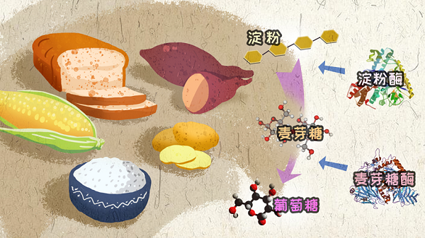日常饮食中,淀粉的初级形态是馒头、米饭等固态的食物,人通过在口内咀嚼,固态食物被分解成一个个小碎块,然后通过食道进入胃中。这时淀粉的化学形态开始发生了变化,一部分淀粉被唾液里的淀粉酶催化,发生水解反应,生成麦芽糖,但是因为唾液中的淀粉酶有限,一些没有水解反应的淀粉会从胃走到小肠,接着在胰脏分泌的淀粉酶的作用下,继续水解。淀粉水解成麦芽糖,这就是淀粉的第二次“变身” 。