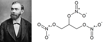 左图为阿尔弗雷德·伯纳德·诺贝尔 右图为硝化甘油结构式