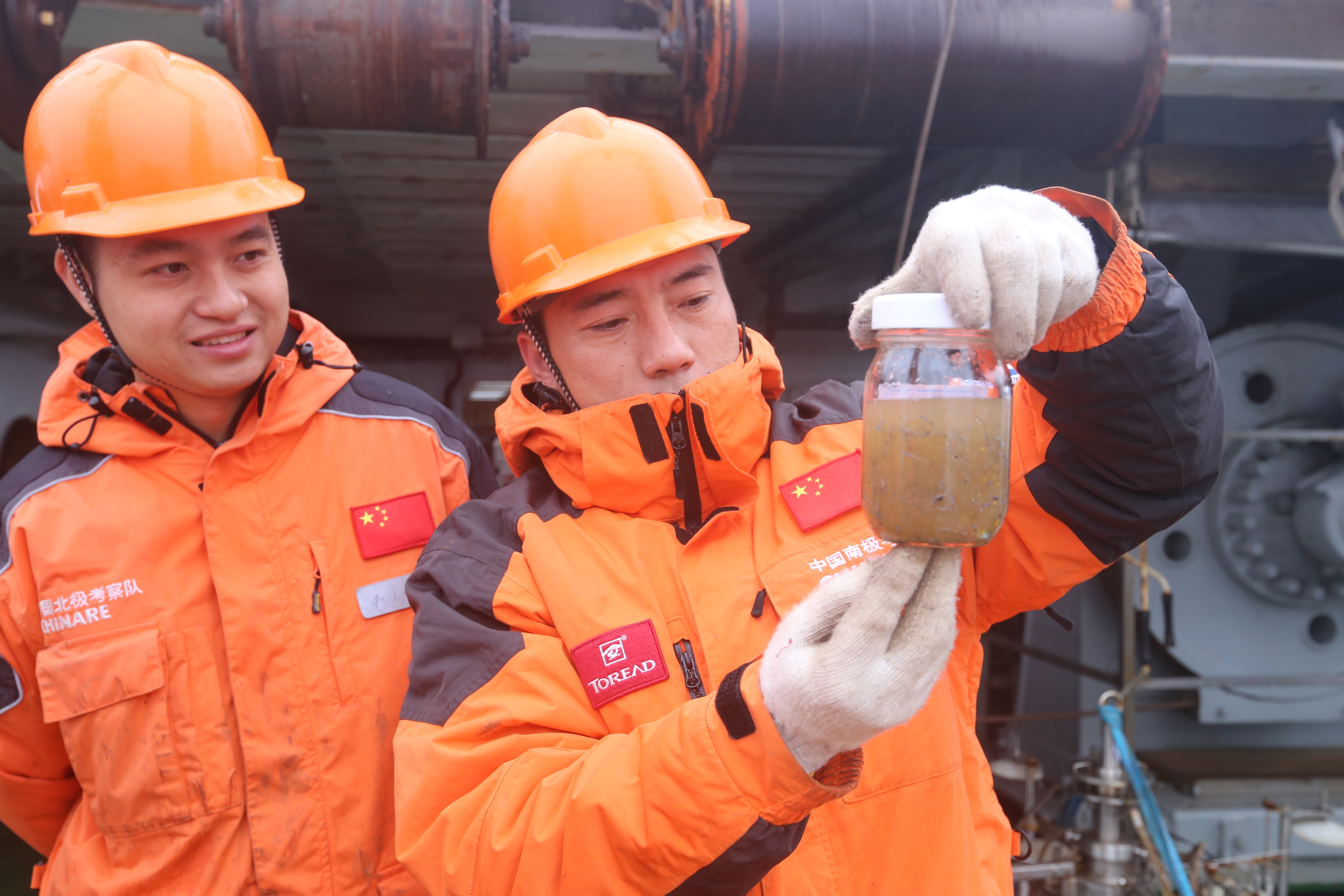 中国第八次北极考察队员观察在北冰洋海域拖网采集的表层海水微塑料样品