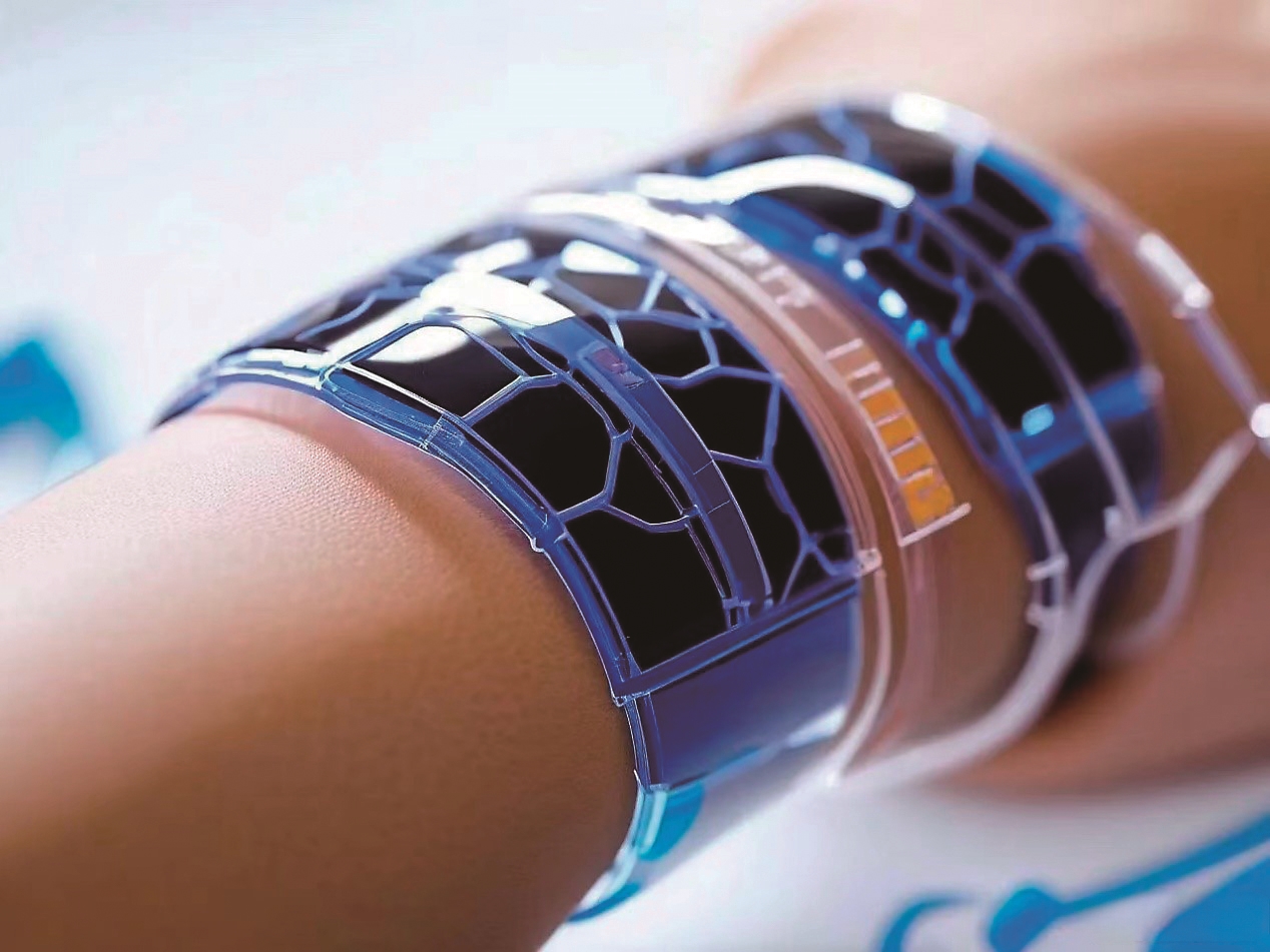 图为基于柔性电极材料开发的可穿戴电子设备。AI制图