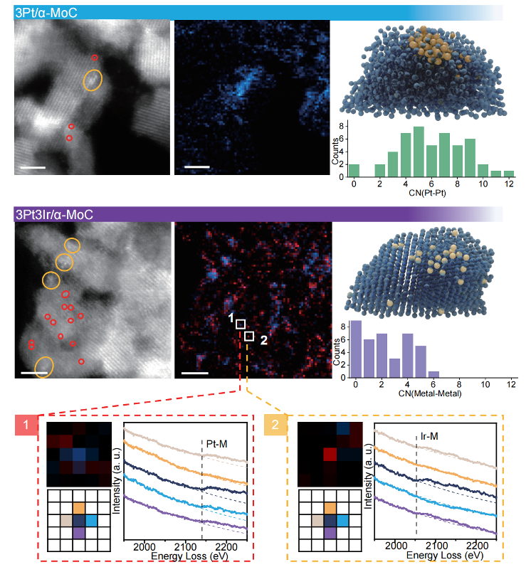 研究团队开发的新型铂-铱双金属催化剂(PtIr/α-MoC),其核心创新在于原子尺度的界面工程设计。单原子分辨的低压扫描透射电镜(STEM)电子能量损失谱(EELS)成像分析表明,在3wt%负载的3Pt/α-MoC催化剂中,Pt物种主要以单原子和团簇的形式存在于MoC表面,其中Pt团簇的尺寸约为1 nm。而在催化剂中引入相近载量的Ir物种后,3Pt3Ir/α-MoC催化剂中Pt物种的分散性得到了显著提升,同时Ir主要以高分散的单原子形式存在。这一结果源于原子级分散的Pt和Ir物种与α-MoC载体之间不同程度的强相互作用,其中Ir优先在载体表面落位,有效促进了Pt的分散,同时约束了Pt颗粒的生成,从而构建高密度的界面催化活性位点,并且避免贵金属颗粒的形成,有效抑制了催化过程中C-C键的断裂。这一设计确保了催化剂能够在温和条件下高效活化乙醇-水体系,并保持长期稳定性。