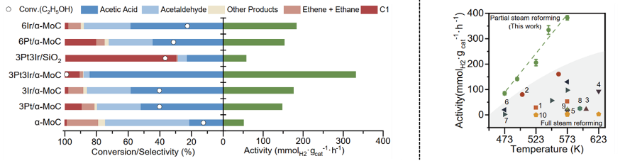 针对上述挑战,中国科学院大学周武教授课题组与北京大学马丁教授课题组、北京大学周继寒研究员课题组以及英国卡迪夫大学Graham J. Hutchings教授携手合作,基于周武教授与马丁教授团队在金属-碳化钼(M/α-MoC)催化剂体系近十年的合作研究积累( Nature 2017, 544, 80-83; Science 2017, 357, 389-393; Nature 2021, 589, 396-401),开创性地提出金属-碳化钼体系"选择性部分重整"制氢新技术。这一技术通过原子级精准设计、调控Pt/Ir双金属-α-MoC界面,将乙醇-水重整反应从传统的完全重整(氧化)路径转变为选择性部分重整路径(C2H5OH + H2O → 2H2 + CH3COOH),在270℃温和条件下实现高通量氢气制备,同时联产高值化学品(乙酸)。