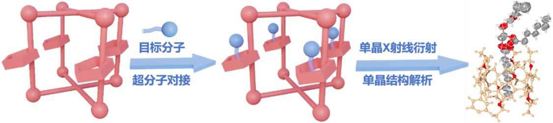 对于这类样品,传统的晶体海绵法可以将它们络合进入金属有机框架(MOF)的孔道中,然后用单晶X射线衍射分析对其进行结构测定。然而,传统的晶体海绵样品制备过程繁琐,对目标分子缺乏选择性识别能力,解析精度存在一定问题。因此,长烷基链分子被晶体海绵络合后会产生十分无序的结构,使得确定它们的单晶结构十分困难。
